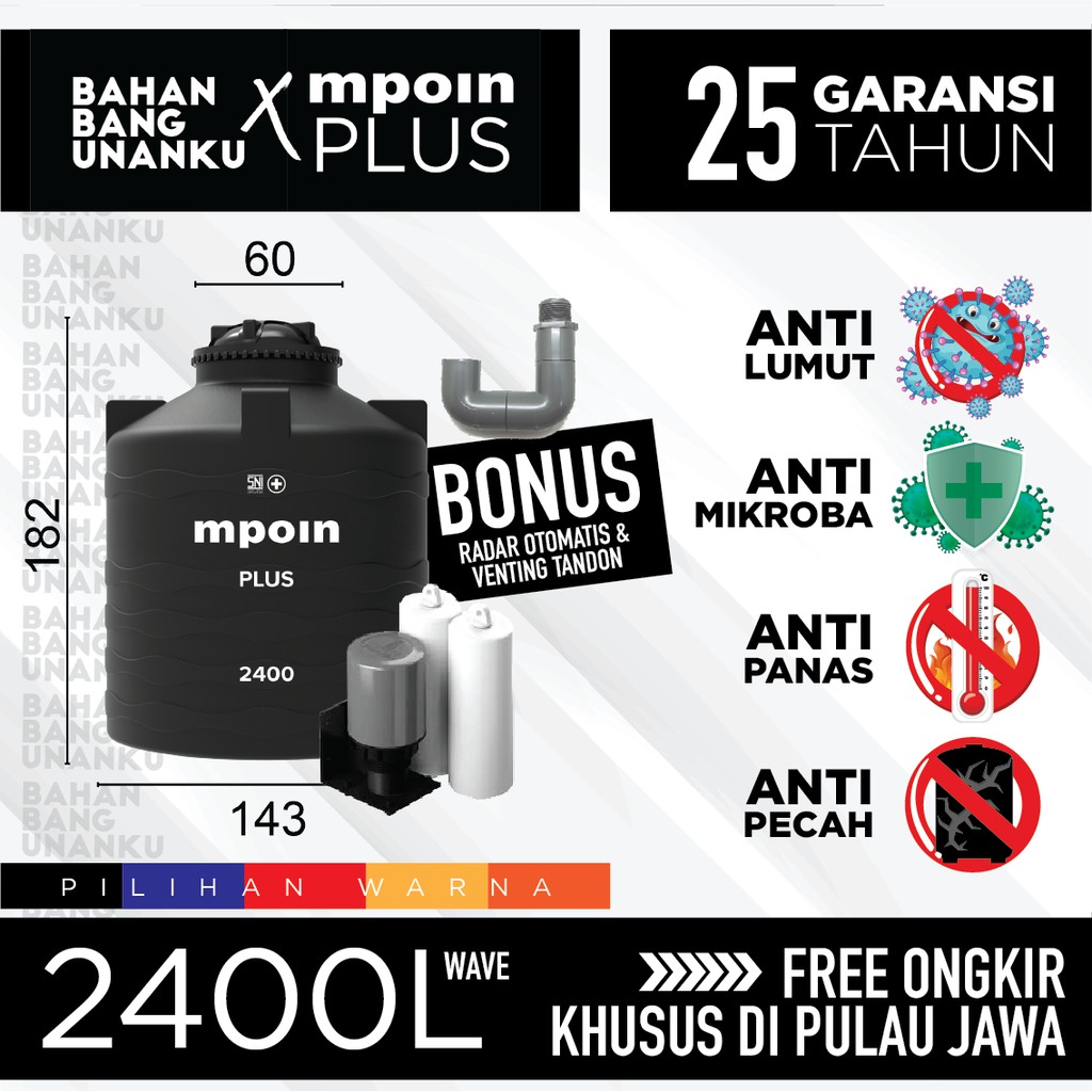 SPESIFIKASI (bisa lihat di gambar profile):Inlet & Outlet:Ukuran 285L - 900L: 3/4 INCHUkuran 1100L - 3600L: 1 INCHUkuran 3600L - 11,000L: 2 INCHBIOPLUS - 4 INCH=========================TANGKI AIR MPOIN PLUSGRATIS PELAMPUNG OTOMATIS.GRATIS J-VENTING UNTUK UKURAN 550L - 2400LGRATIS T-VENTING UNTUK UKURAN >2400LGARANSI ANTI PECAH 25 TAHUN TANGKI AIR | 3 TAHUN TANGKI TANAM | 1 TAHUN TANGKI BIOPLUS & KIMIAGARANSI ANTI LUMUT 1 TAHUNBerlapis Anti Bakteri Air keruh & rasa tidak enak hilang dalam 24 jam berada didalam tangkiTersedia ukuran 280L - 11000L=============================MOHON DIBACA SEBELUM ORDER!-Chat kami sebelum order untuk ketersediaan stock.-Untuk pilihan warna mohon ditulis di PESAN PEMBELI pada saat pemesanan. Jika tidak mencantumkan pilihan warna maka kami akan kirimkan warna seadanya. -Lama Pengiriman berkisar 1-14 hari kerja.Syarat dan ketentuan berlaku.=======================TEKNOLOGI ANTIMICROBIAL SILVER IONDengan teknologi Antimicrobial silver ion yang diimpor langsung dari Amerika dan telah teruji sesuai ISO 22916-2011 yang mampu membasmi 99,99% mampu membunuh bakteri jahat dan jamur dalam air menjadikan lebih aman dan higienis digunakan untuk mandi, berkumur, sikat gigi, mencuci sayuran, buah, piring dan peralatan makan lainnya, dan aman untuk kesehatan.ANTIMIKROBATeknologi silver ion dari Amerika mampu membasmi 99,99% bakteri dan jamur dalam air.BEBAS LUMUTLightblock yang melindungi tangki dari sinar UV dan tidak tembus cahaya sehingga tangki tidak berlumut.TAHAN LAMAMenggunakan bahan Dow Chemical America yang membuat tangki 10x lebih elastis dan tidak mudah pecah, tangki tidak sekeras tangki pada umumnya, dan lebih kuat menahan tekanan.WARNA TIDAK PUDARSistem pewarnaan compounding pada tangki menjadikan warna tidak pudar meskipun terkena cuaca e